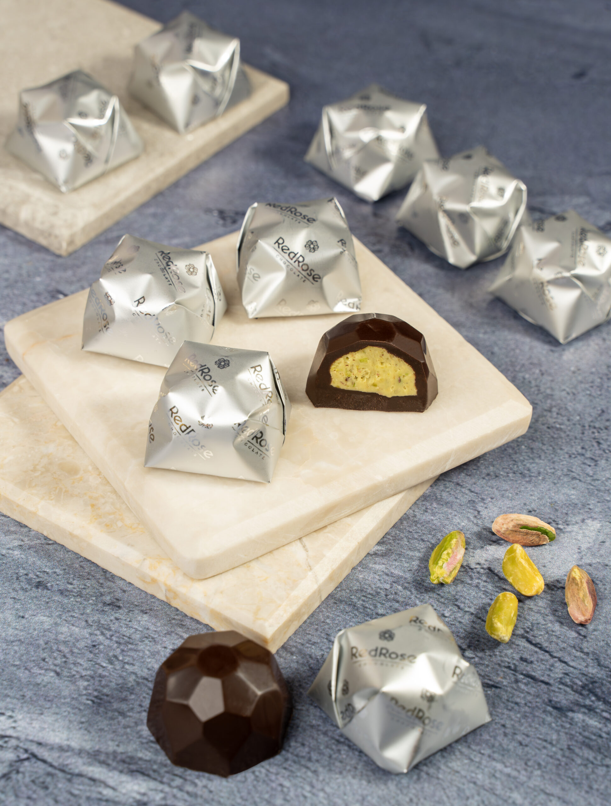 Rich dark chocolate filled with pistachio cream